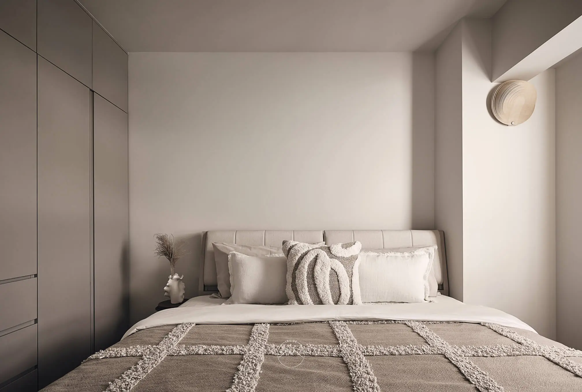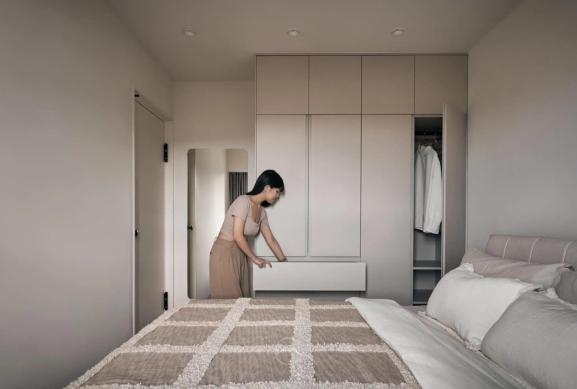 以白色與米色為基調,營造柔和安定的休憩氛圍。整面收納櫃體採平整無把手設計,延續牆面色系,呈現乾淨俐落的立面。