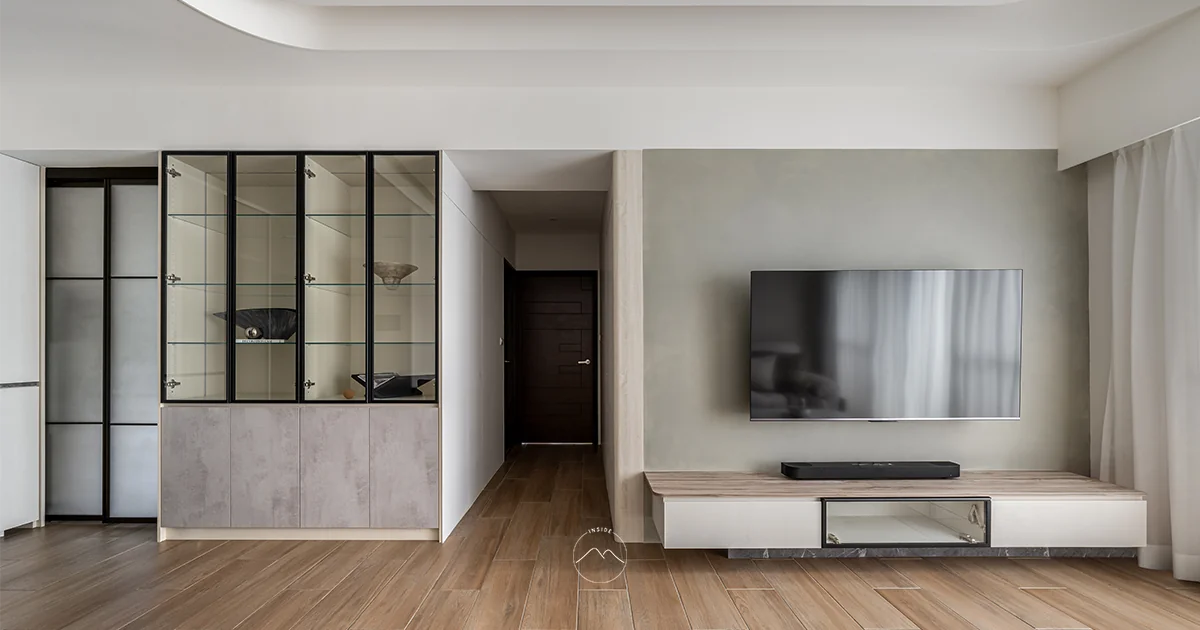 「灰韻玄關收起紛雜腳步;轉身,電視牆以秩序隱匿日常。」