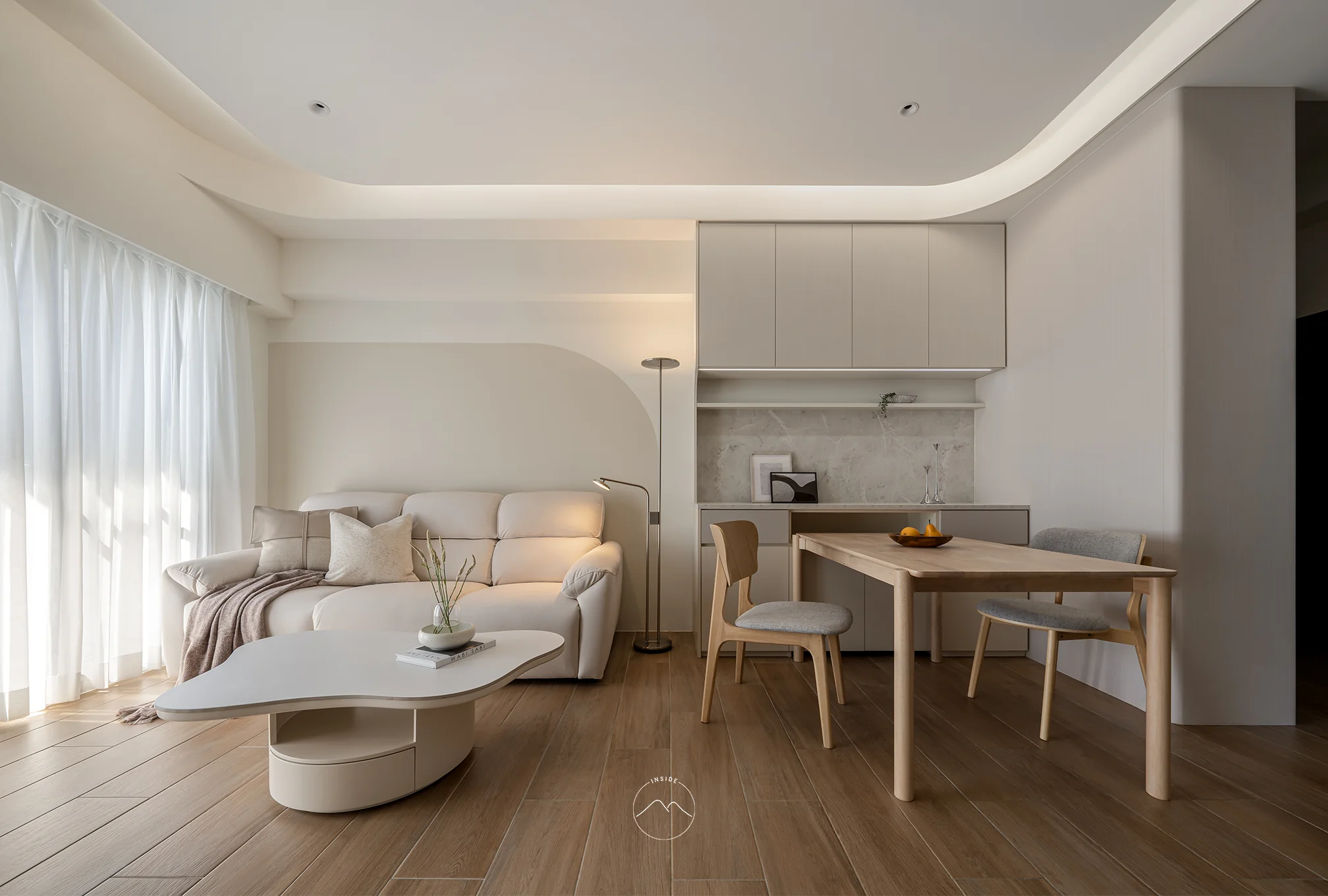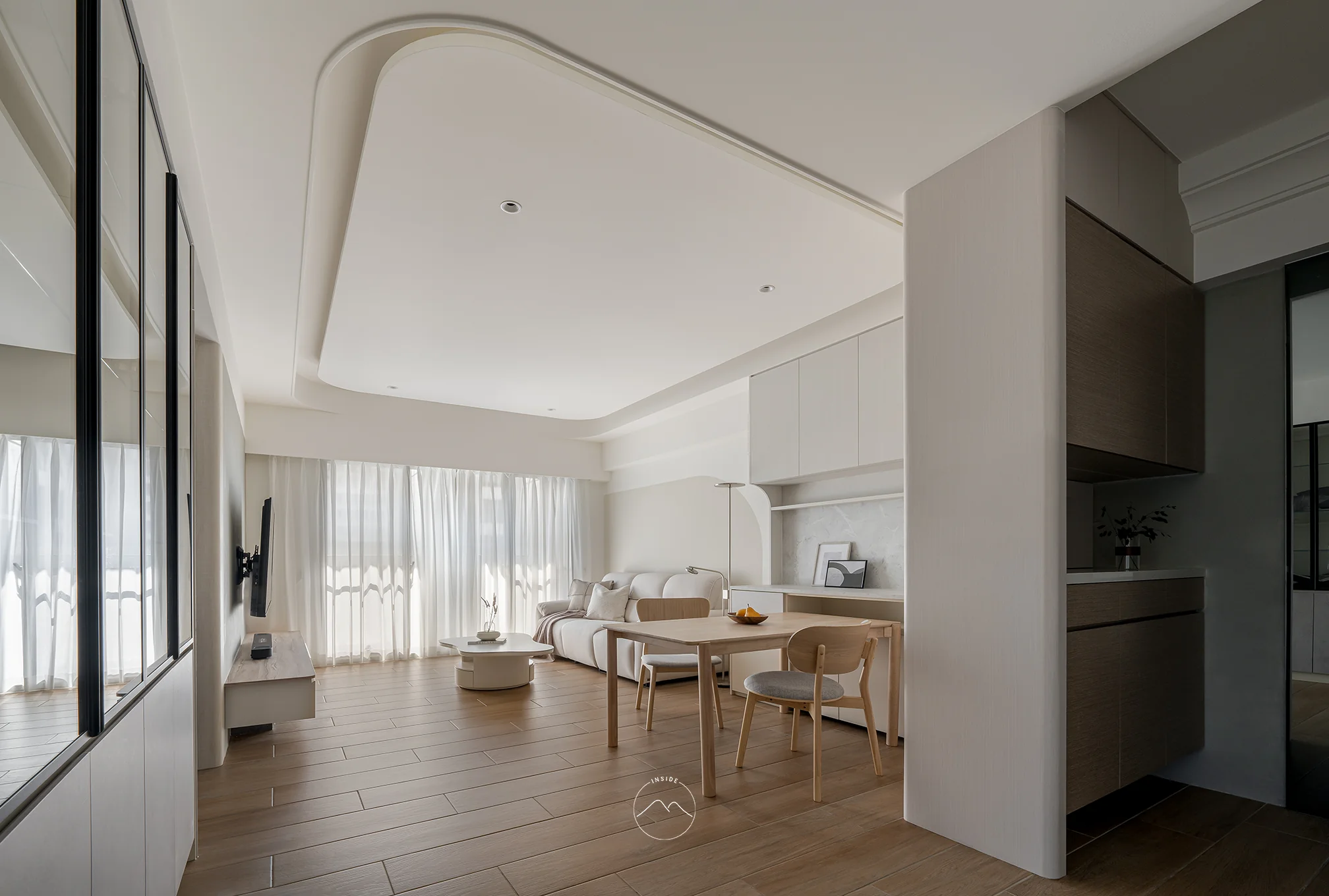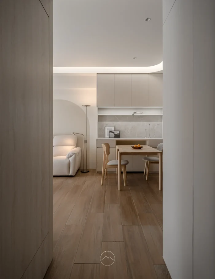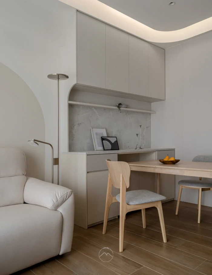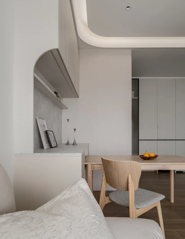 以溫潤的木質地板定調空間的溫度,透過大面積、極致流暢的弧形曲線,消弭了量體的邊界感。嵌入式的間接照明如絲綢般流淌於天花,堆疊出無壓且溫和的光影層次。開放的場域規劃讓玄關、餐廚與客廳自由串聯,在秩序井然的櫃體架構中,異材質拼貼展現細膩,構築出一處全然開放且能自由呼吸的生活核心。