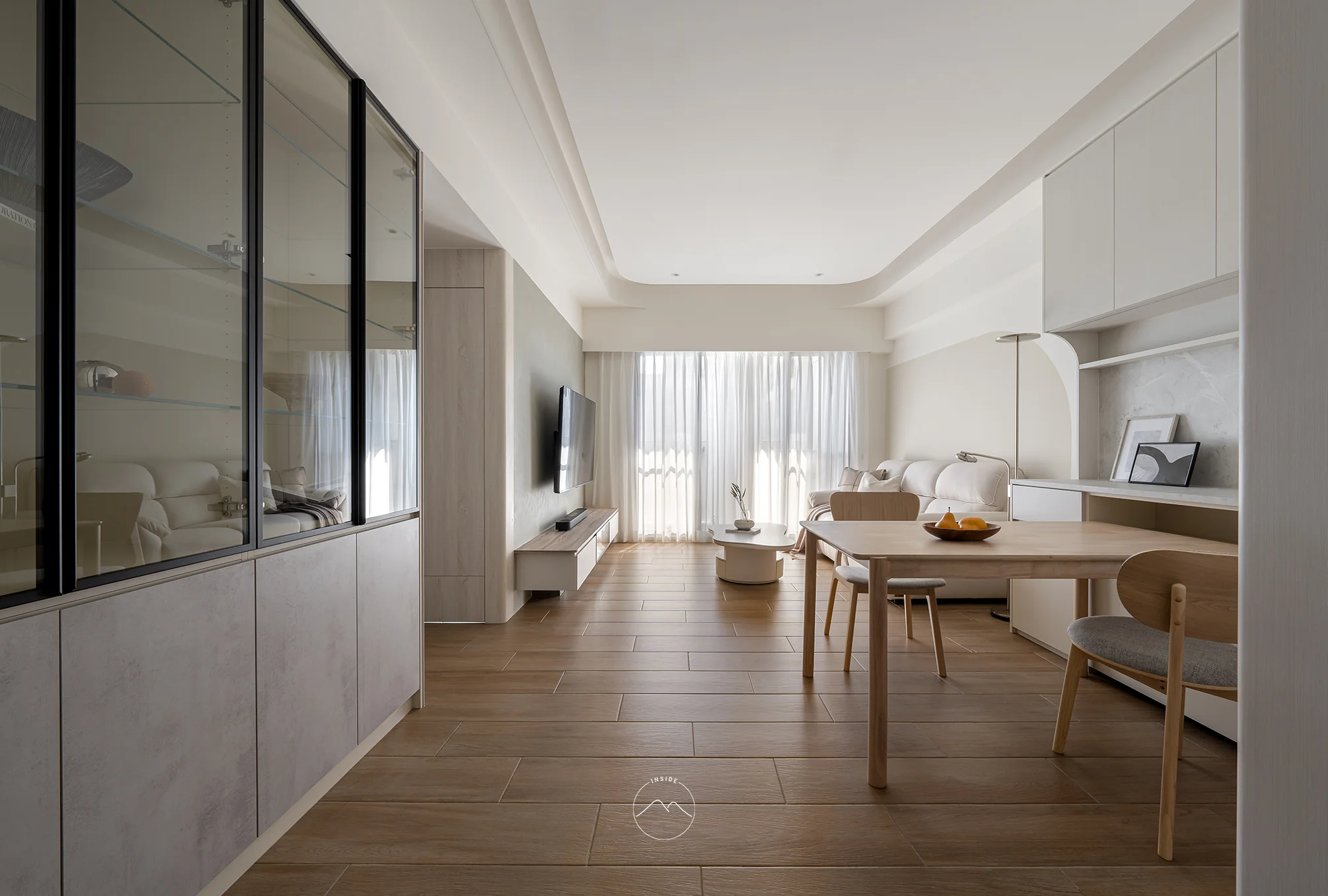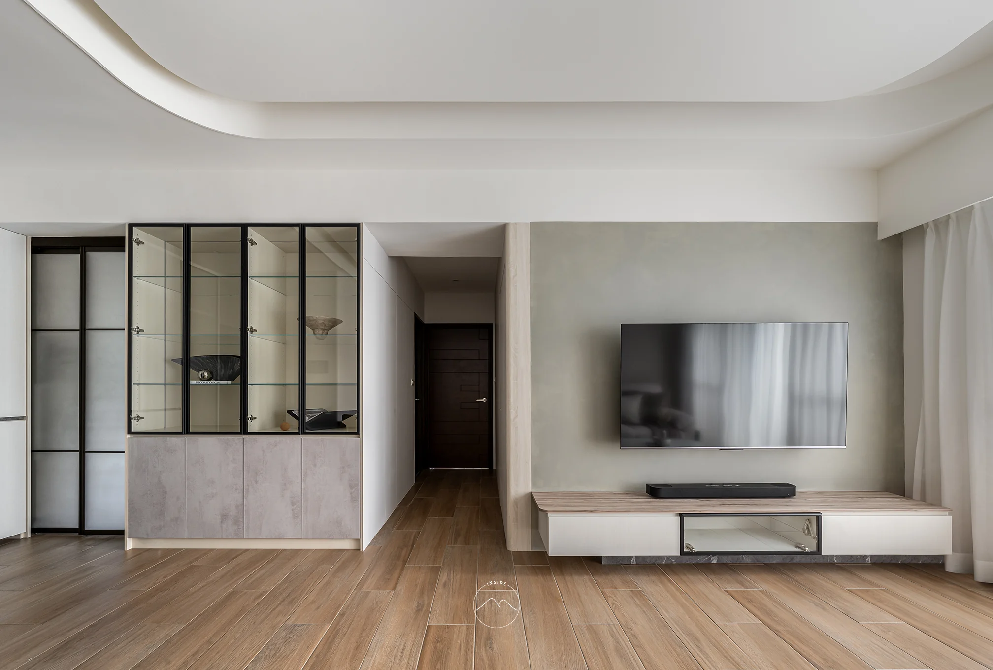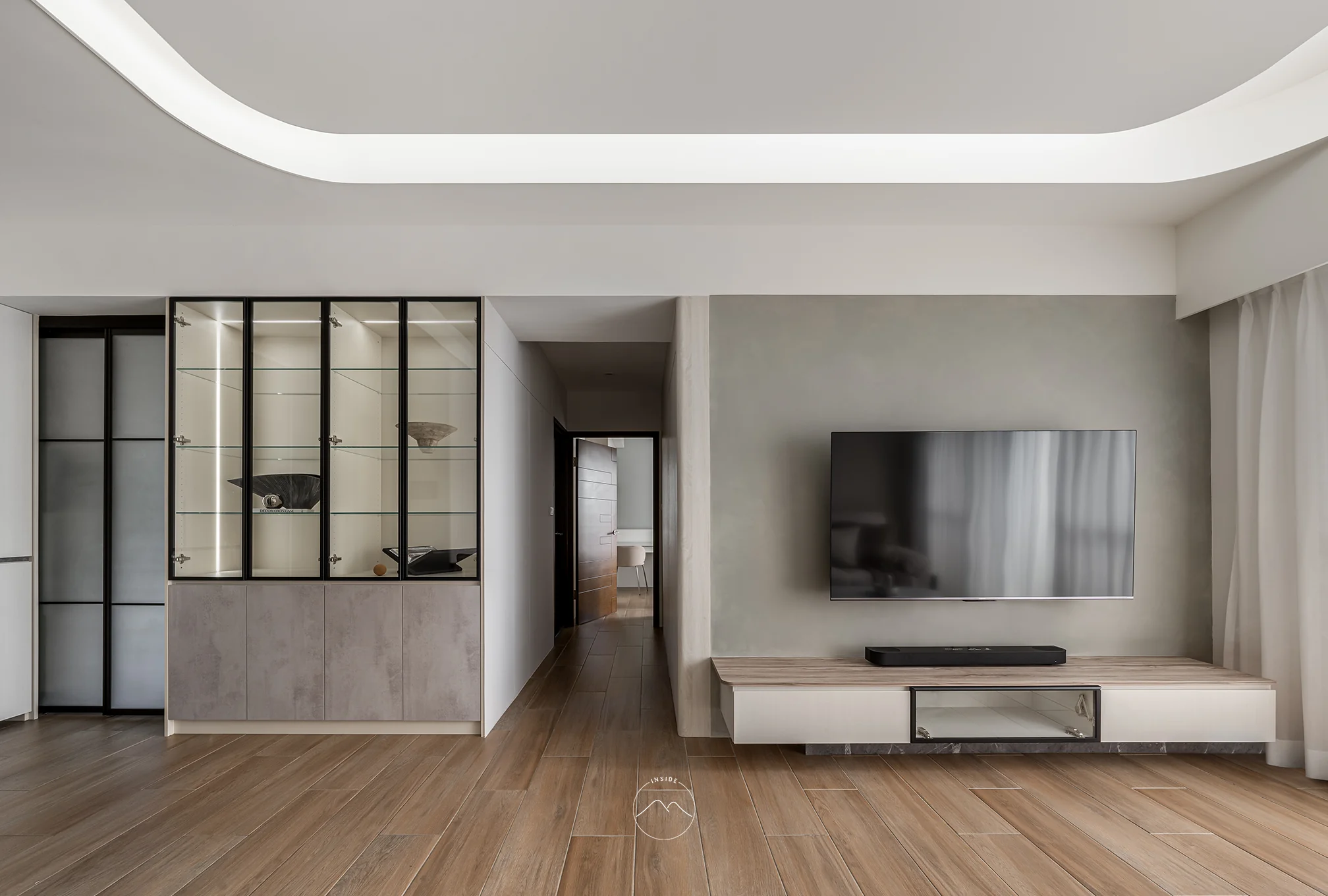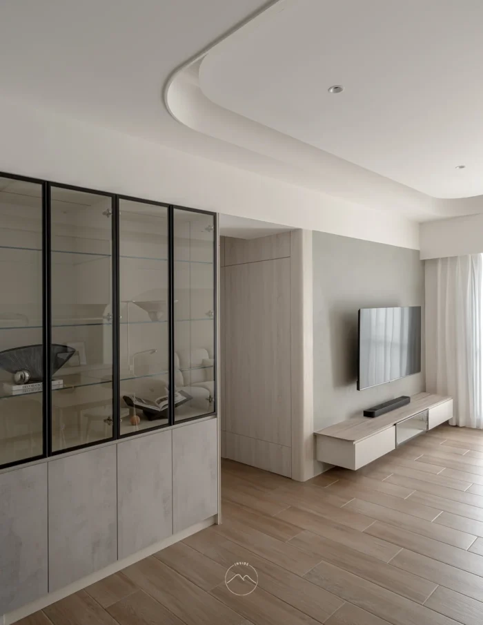 客廳區域是流動生活的集大成者,電視主牆選用具備手感溫度的暖灰色調,與天花的曲面摺線相互呼應。視覺延伸至具有異材質拼貼細節的玻璃展示櫃,讓藏品成為生活的表情。全室採光透過柔霧窗簾自然漫入,映照於木紋與布料之間,讓公領域明亮柔和,兼具實用與自在的伸展。