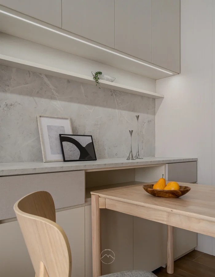 餐廳採取全開放式規劃,木質餐桌椅沐浴在從天花板滑行而下的柔和光曲中,與石紋牆面、展示層板交織出細膩的材質美感。這裡是晨間靜享餐點的溫馨角落,也是午後處理公務、靜心閱讀的最佳場域,讓備餐與陪伴在同一個無邊界的視線水平自在進行。