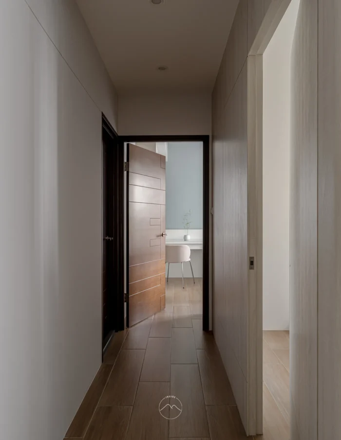動線在木紋地板與立面櫃體間延展開來,簡約的立面設計維持視覺深度,並巧妙隱藏部分機能。廊道維持著整體一致的色彩語言與光影語彙,引領居住者自由轉入未提及的私領域入口,維持場域的簡潔俐落與秩序。