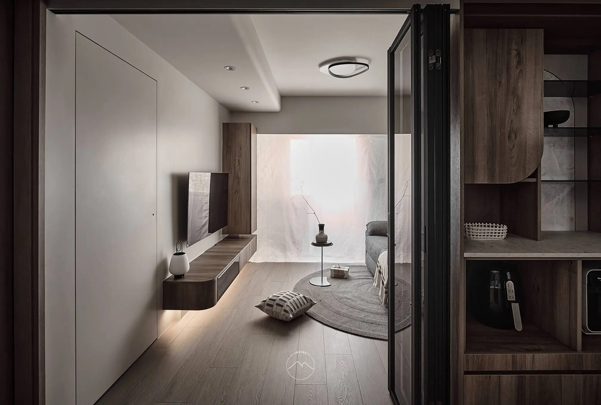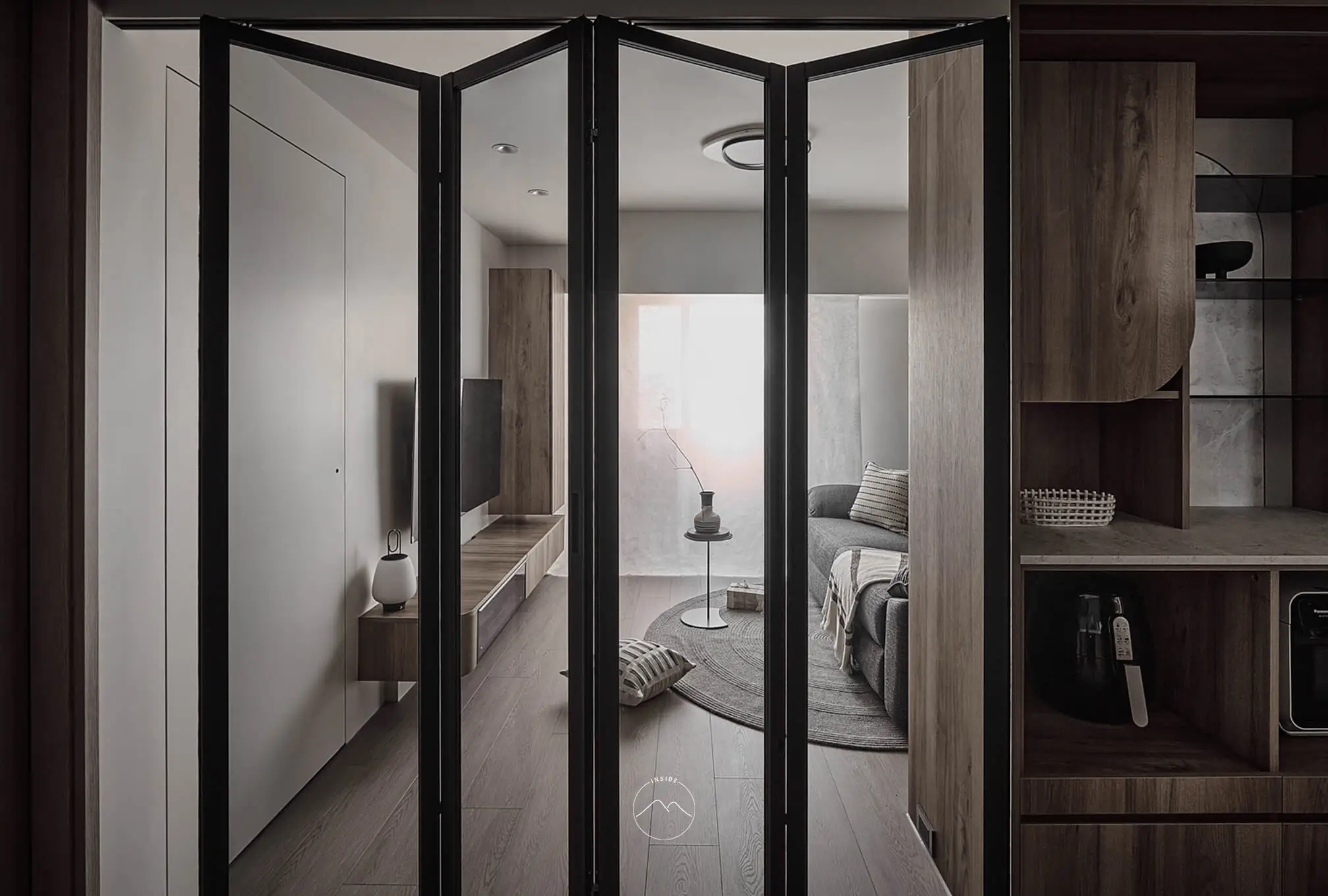 以黑框摺疊玻璃門界定公私領域,維持採光流動與視覺延伸。客廳以木質與白色調鋪敘沉穩氛圍,懸浮電視櫃融入光帶,使量體更顯輕盈。光線透過柔霧窗簾自然漫入,映照於木紋與布料之間,讓空間明亮柔和,兼具實用與舒適。